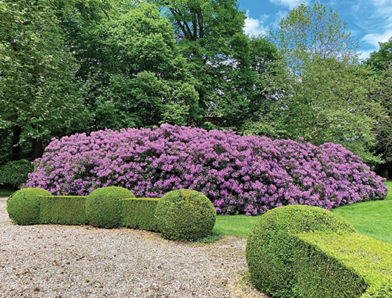 La maison orientée Est et Ouest nous a conduits à privilégier d’abord l’aménagement, à l’Ouest, d’une terrasse entourée de buis suffisamment hauts pour protéger les bains de soleil des vents d’Ouest et du Nord. Cette réalisation à la suite de travaux de remise en état nécessaire du bâti a été le point de départ d’une envie d’aménagement du jardin plus ambitieux. Mais il nous a fallu compter avec une forte pression familiale qui n’a pas manqué de nous rappeler que nous n’étions que de passage et que les projets devaient respecter le legs des générations passées. Les massifs de rhododendrons monumentaux rendus à l’état sauvage, les grands arbres qui marquaient les perspectives nous y incitaient. Ces rhododendrons étant plus ou moins exubérants suivant les années, il faut les tailler sévèrement.